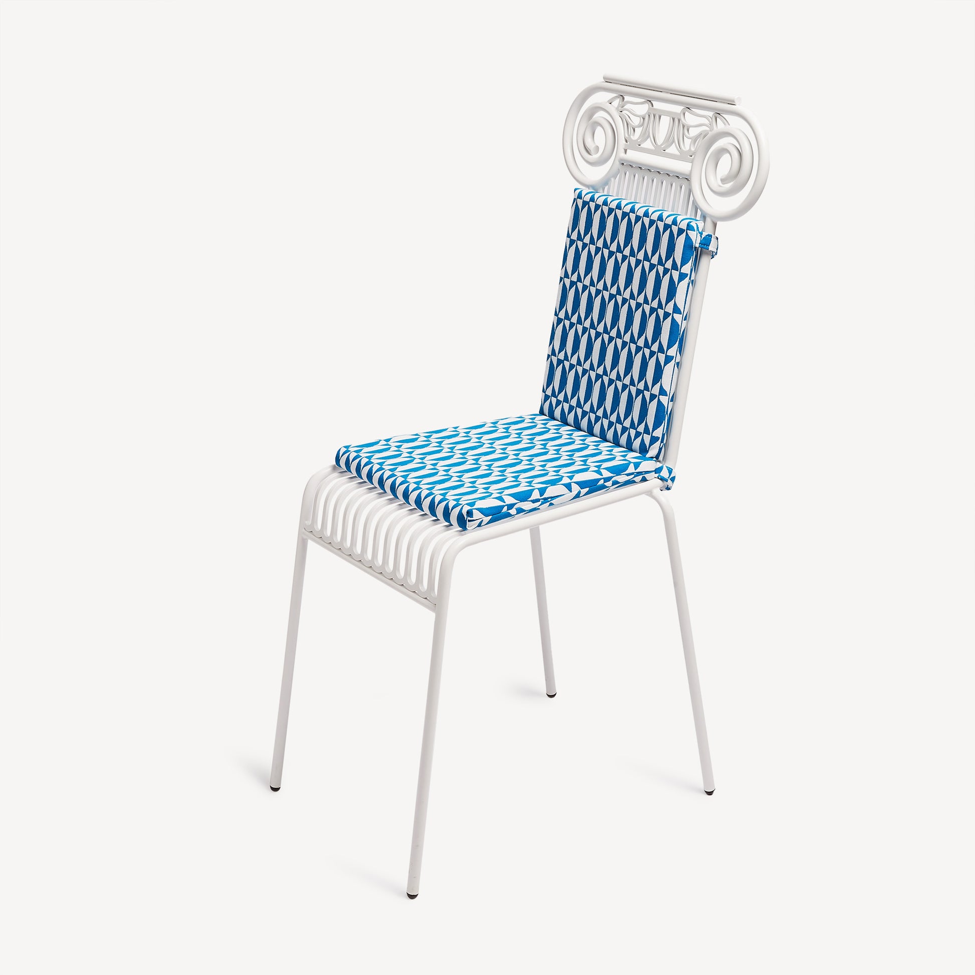 - Il cuscino da esterno Losanghe arricchisce le linee della sedia Capitellum con il motivo decorativo geometrico tratto dall'immaginario Fornasetti.