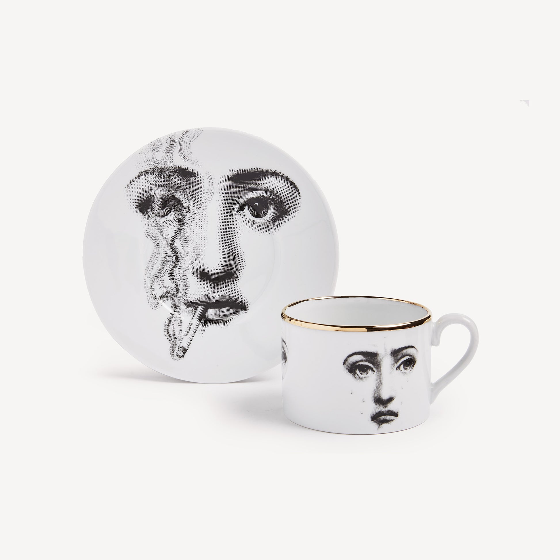 - Il volto della cantante lirica Lina Cavalieri, reinterpretato da Piero Fornasetti, impreziosisce questa tazza da tè in porcellana decorata a mano con inserti in oro, facente parte dell'iconica serie Tema e Variazioni: un vero pezzo da collezione.