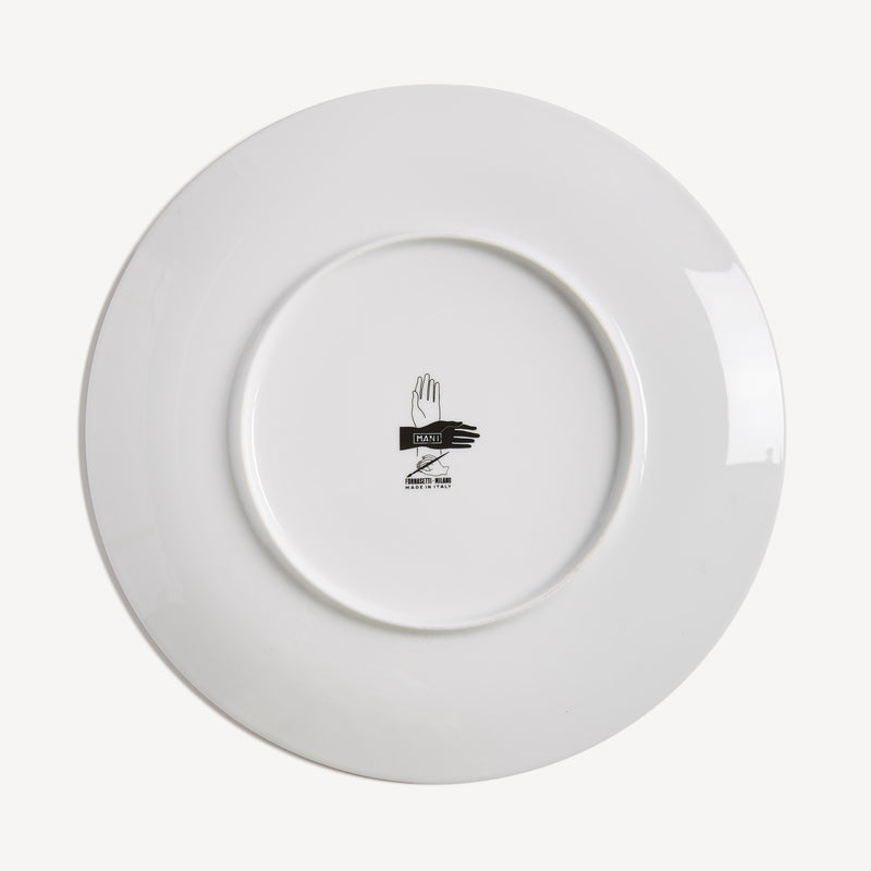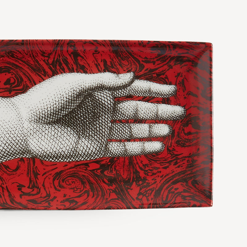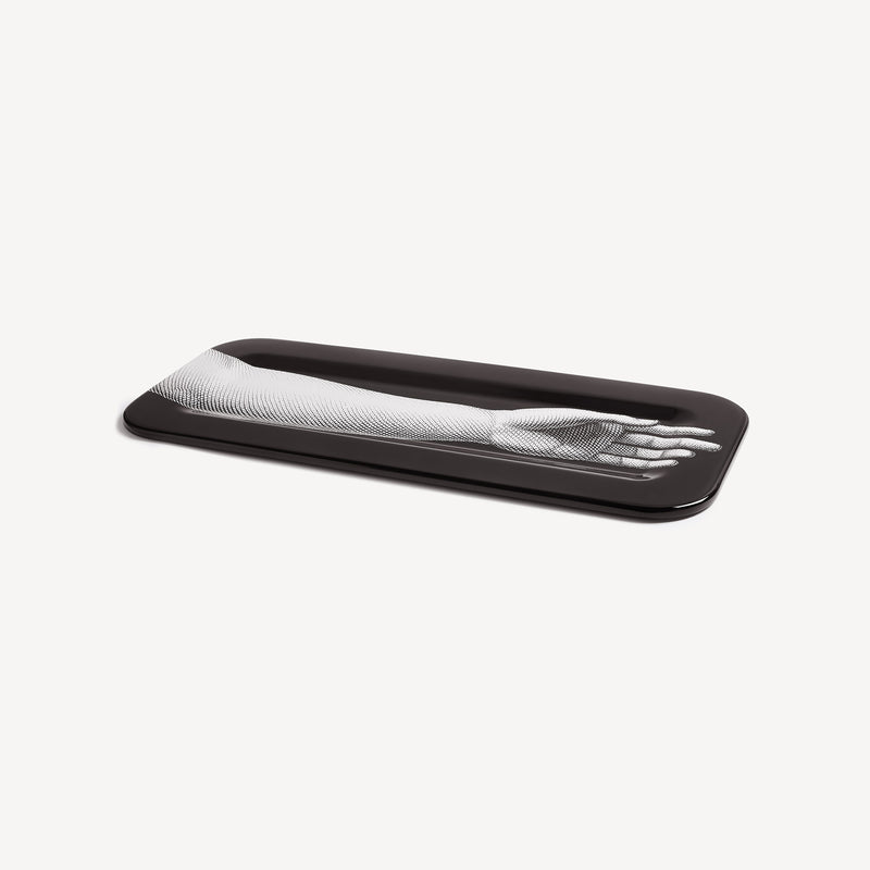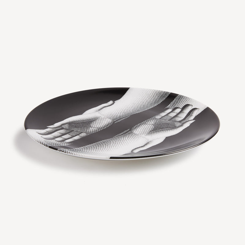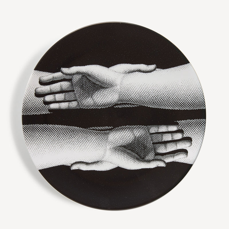 Fornasetti’s talent is expressed through his hands: hands that draw and interpret what the imagination evokes; hands as a self-portrait and archetype of the artist; hands that define the details of the artisan tradition. From the “All’insegna delle dodici mani (Under the sign of twelve hands)” almanac, designed for Gio Ponti, and beyond, the hand is one of the Atelier’s icons.Graphic and refined, it celebrates a passion for lines and compositional designs by playing with repetition, rhythm and fragmentation. Fornasetti furniture, accessories and porcelain become grounds for straying beyond the boundaries of the tangible.