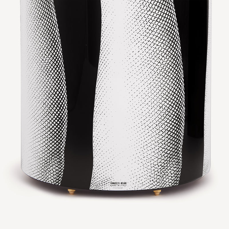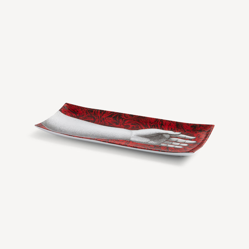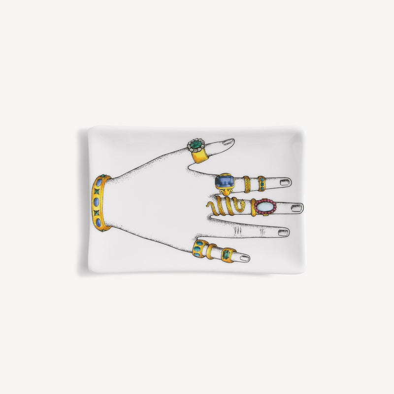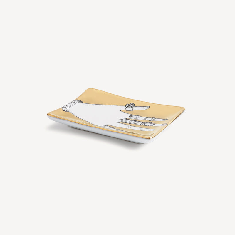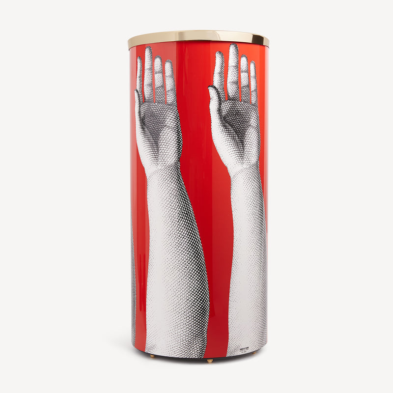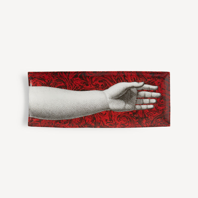Fornasetti’s talent is expressed through his hands: hands that draw and interpret what the imagination evokes; hands as a self-portrait and archetype of the artist; hands that define the details of the artisan tradition. From the “All’insegna delle dodici mani (Under the sign of twelve hands)” almanac, designed for Gio Ponti, and beyond, the hand is one of the Atelier’s icons.Graphic and refined, it celebrates a passion for lines and compositional designs by playing with repetition, rhythm and fragmentation. Fornasetti furniture, accessories and porcelain become grounds for straying beyond the boundaries of the tangible.