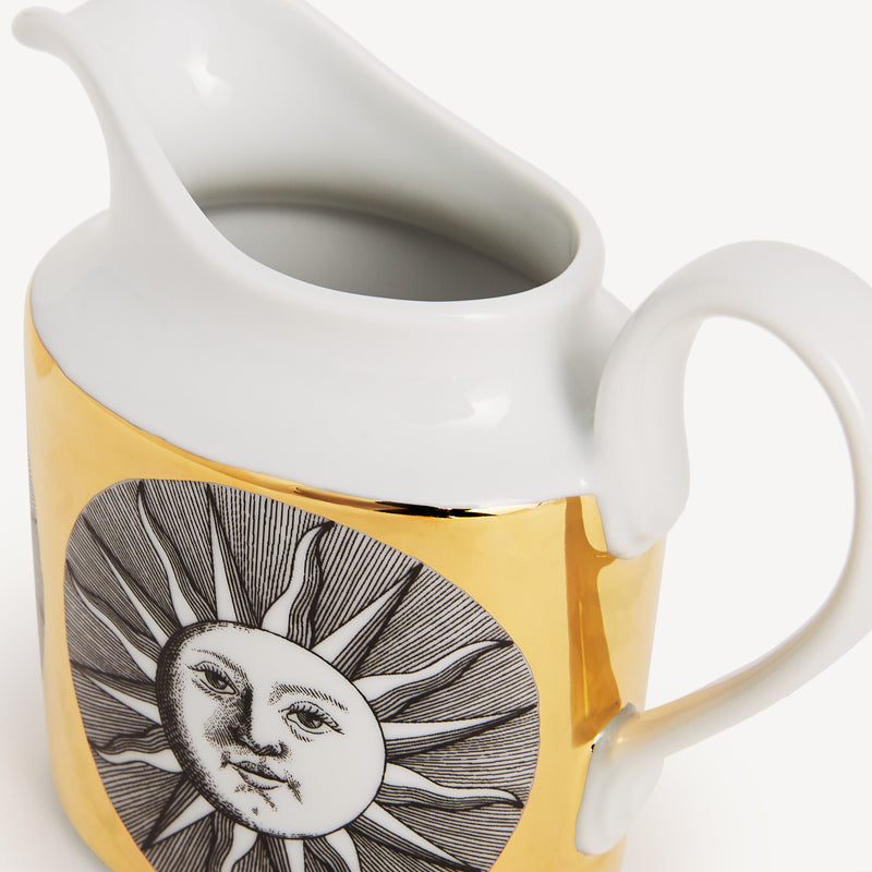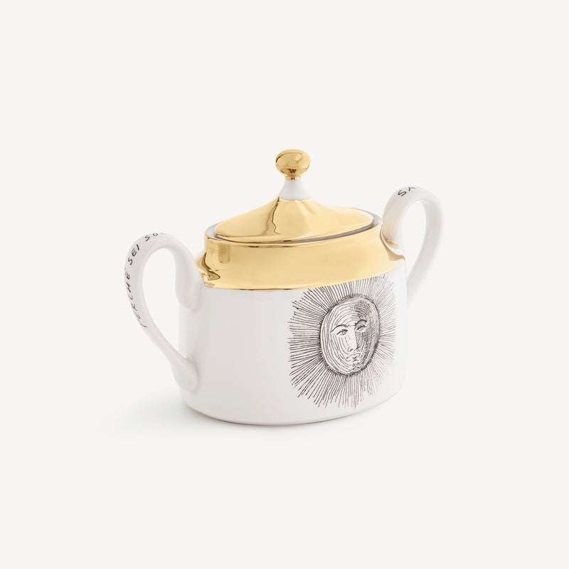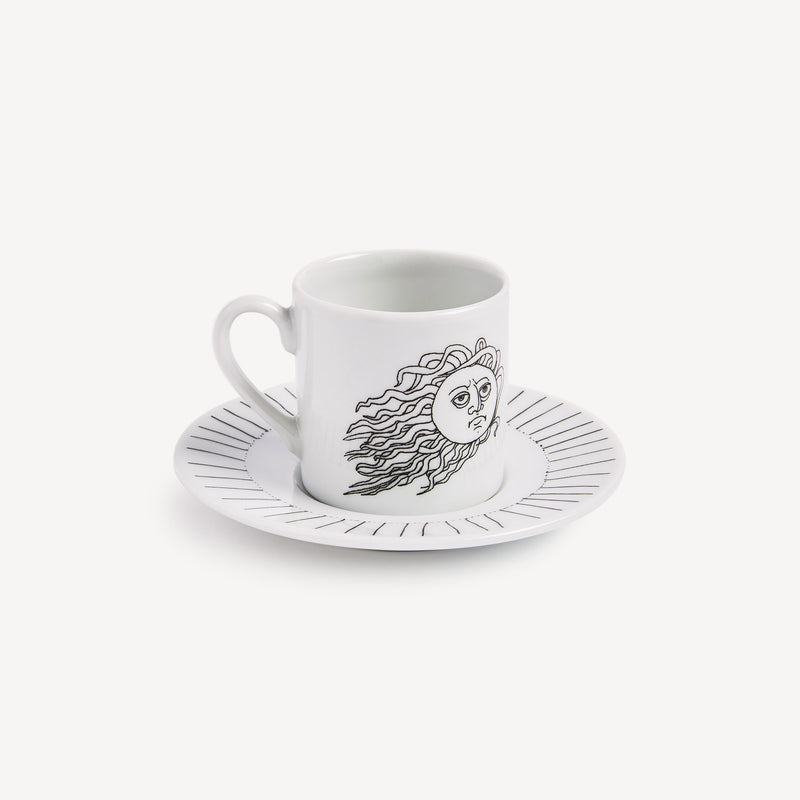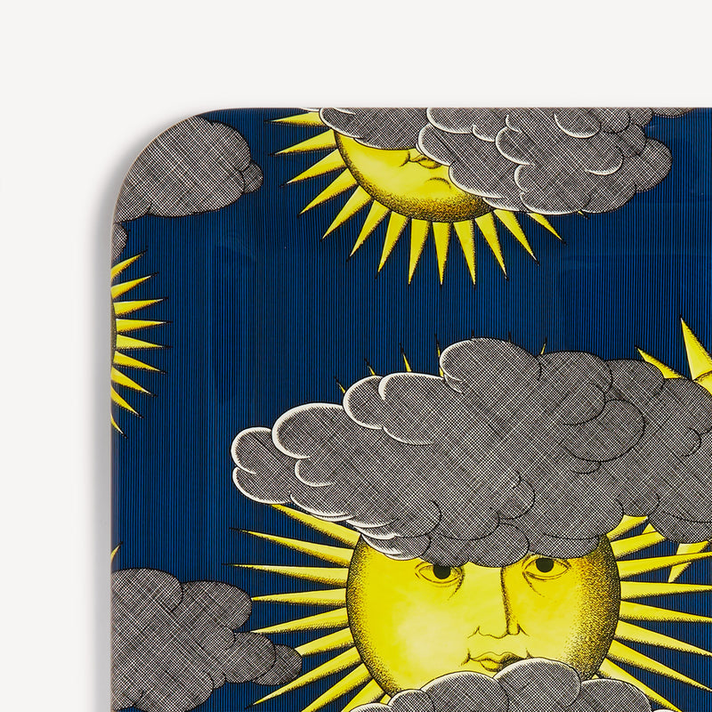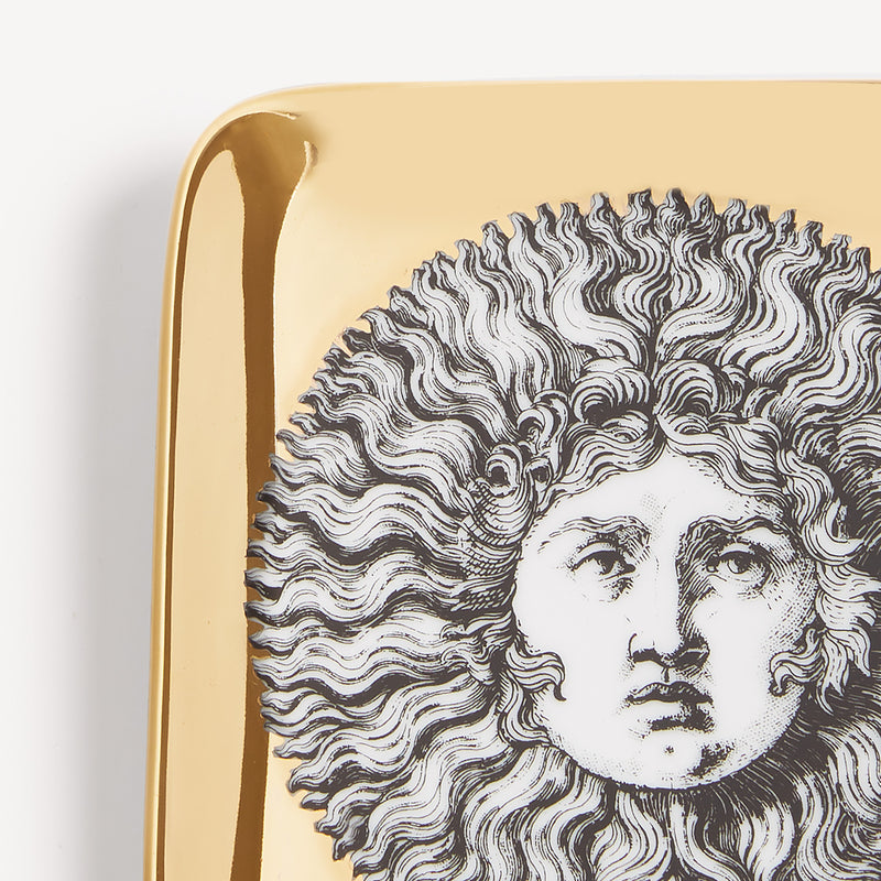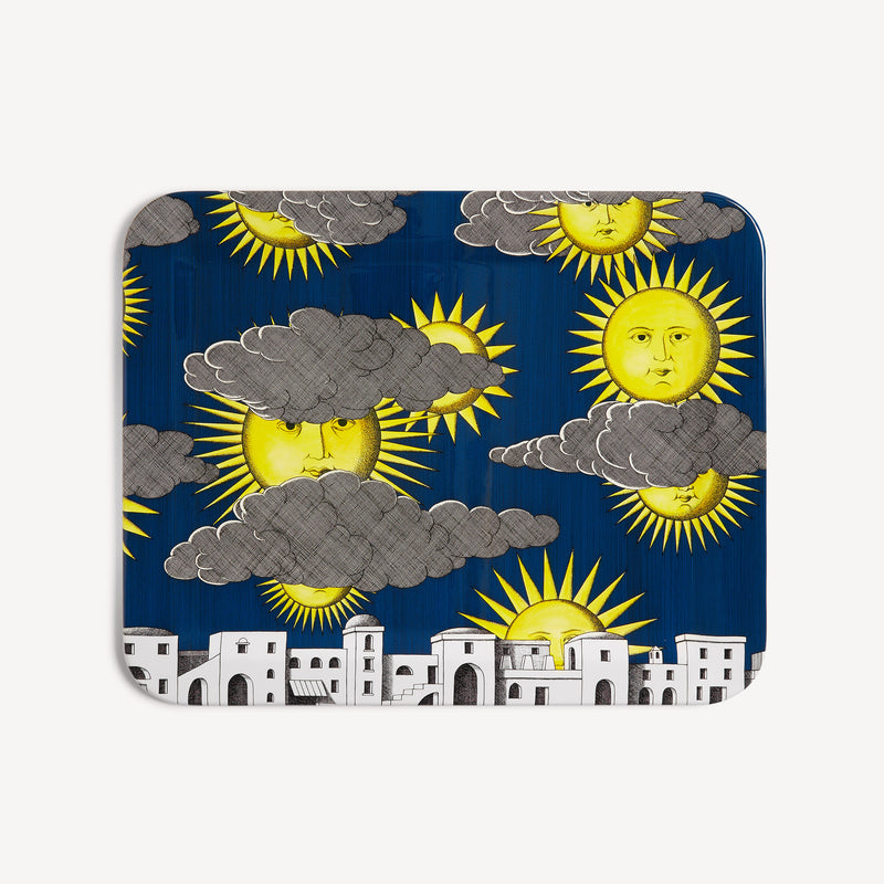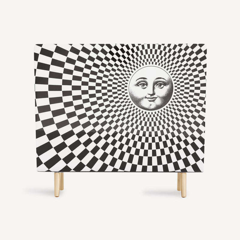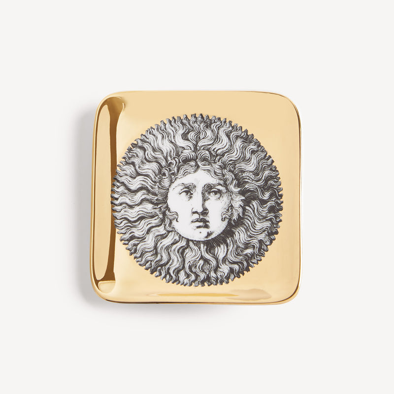 When the Sun comes together with Fornasetti’s pen it leaves the natural dimension and enters an imaginary one. Transformative and eccentric, it takes on the features of a human face; it smiles; it displays its austere, regal side or pushes through the clouds to light up the white, geometric architecture of Capri. Inspired by almanacs, calendars and popular imagery, Fornasetti’s creativeness transforms it with elegant contours, elevating it to a sophisticated, timeless decoration.