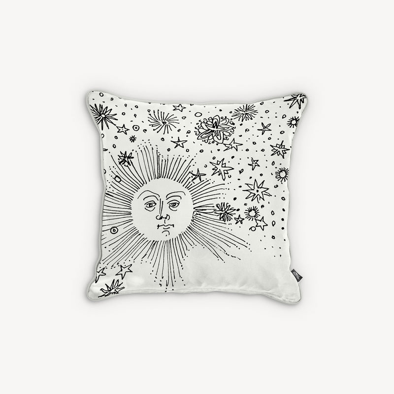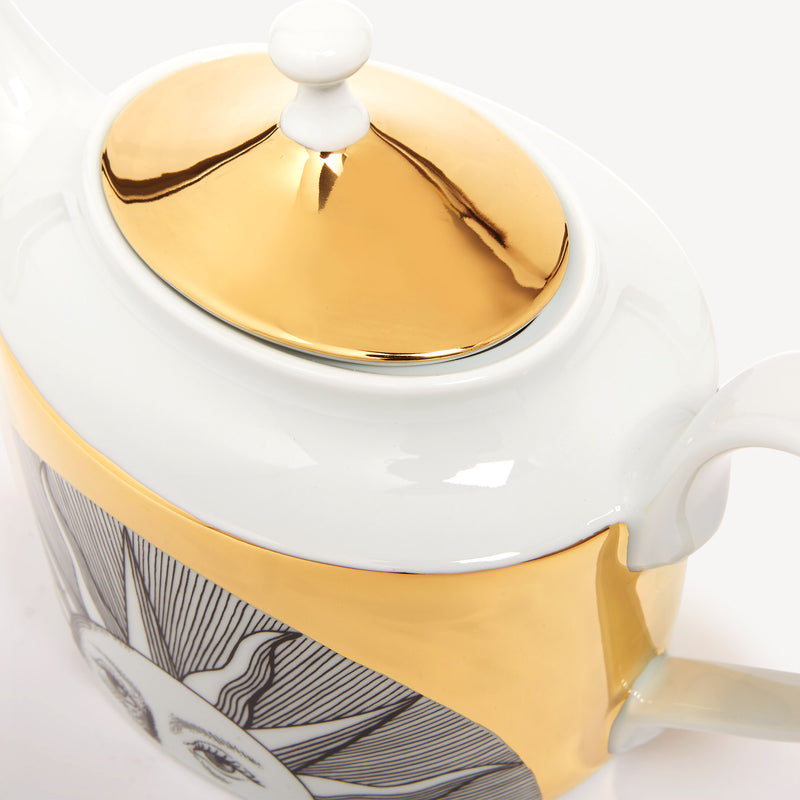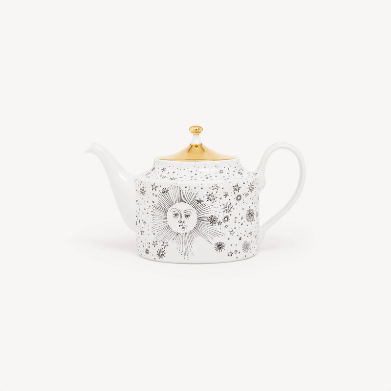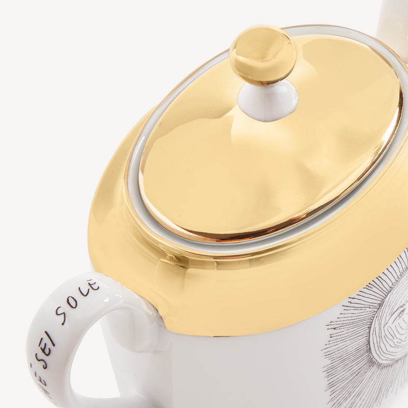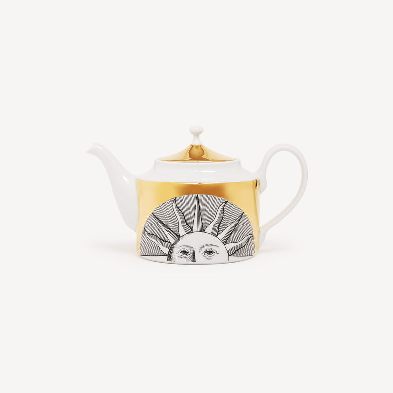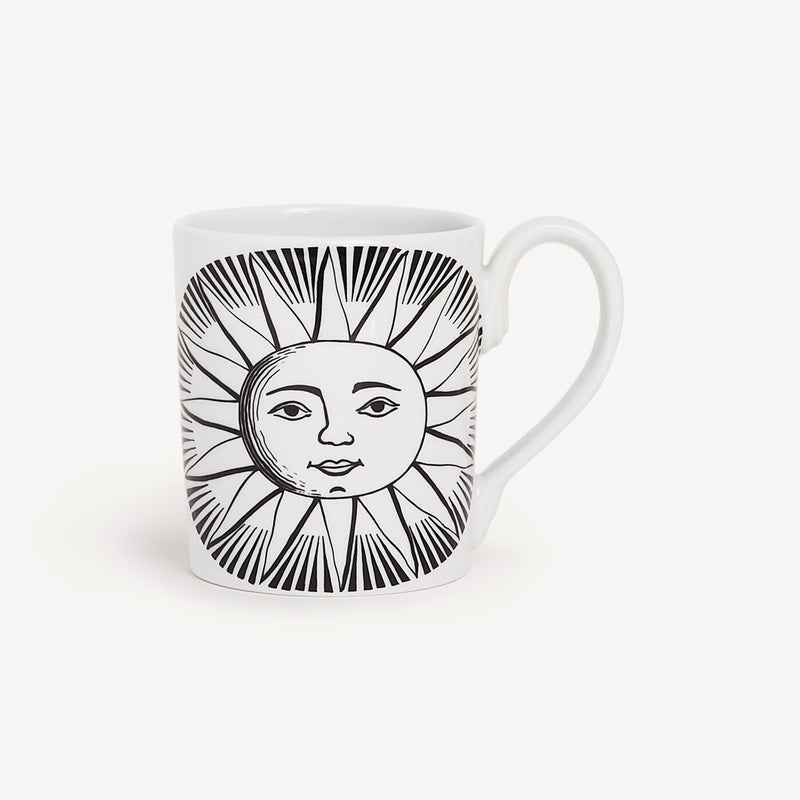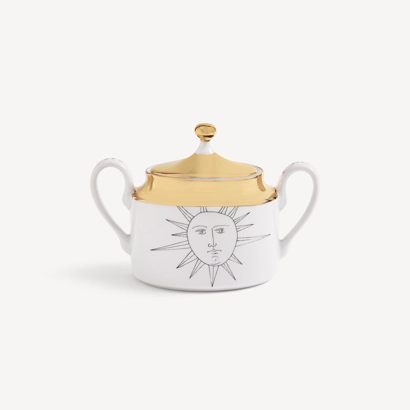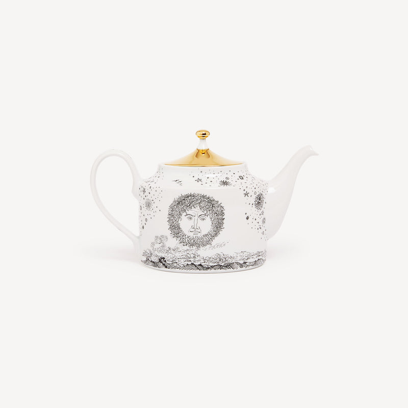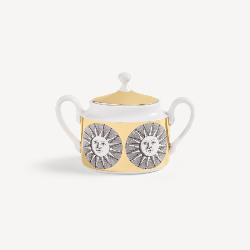 When the Sun comes together with Fornasetti’s pen it leaves the natural dimension and enters an imaginary one. Transformative and eccentric, it takes on the features of a human face; it smiles; it displays its austere, regal side or pushes through the clouds to light up the white, geometric architecture of Capri. Inspired by almanacs, calendars and popular imagery, Fornasetti’s creativeness transforms it with elegant contours, elevating it to a sophisticated, timeless decoration.