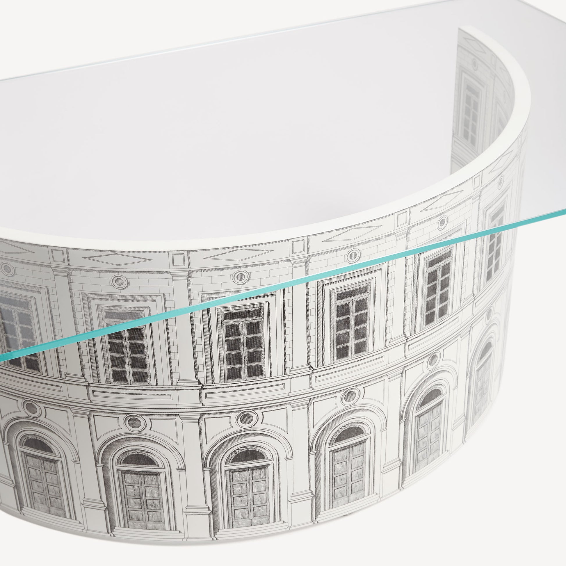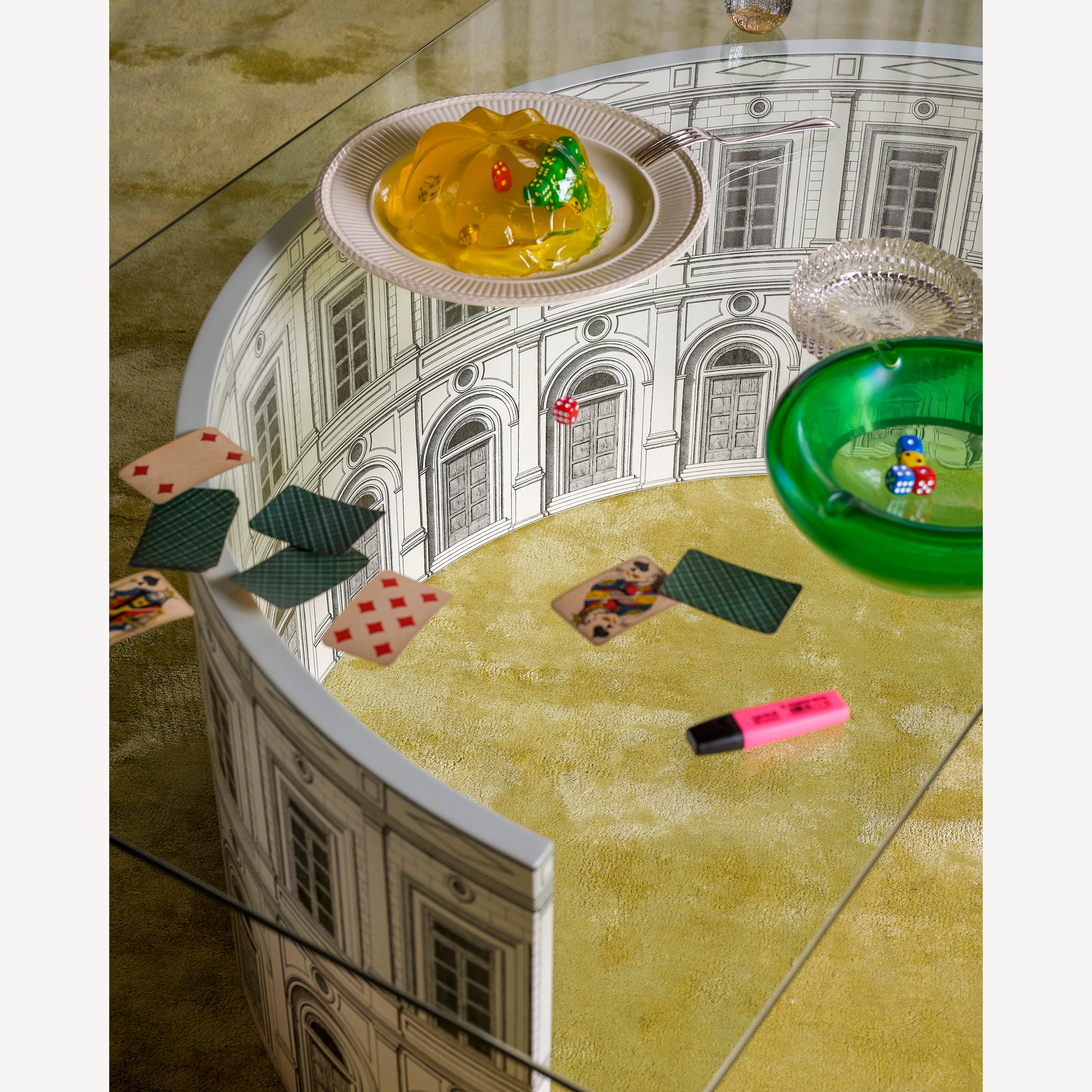 - This table plays with its curved shape and with the design of the architectural decoration to simulate the presence of a real amphitheatre, surprising with its proportions. Screen-printed and decorated by hand, it is fitted with an extra-clear glass top and a wooden base.