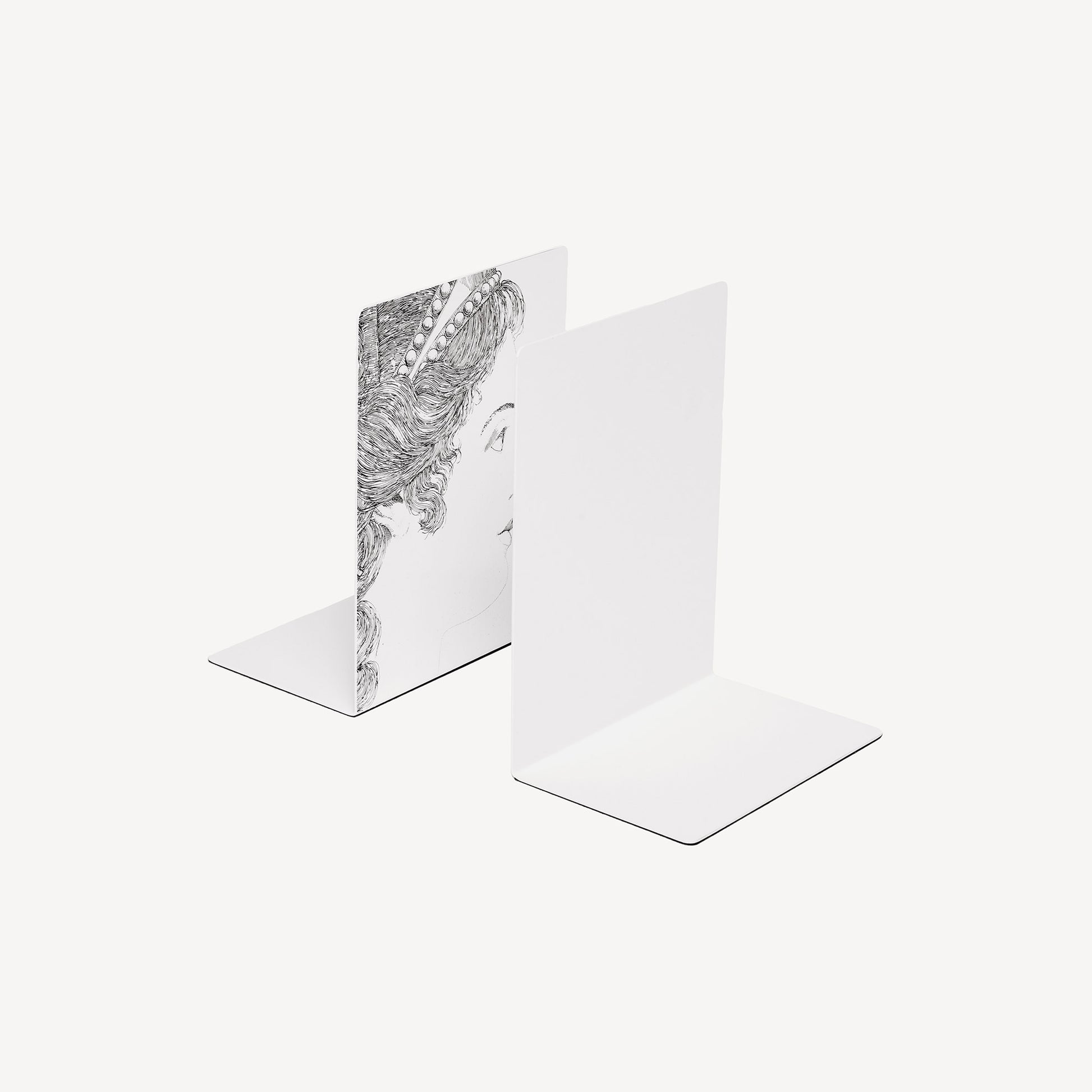 - This pair of hand-silkscreened metal bookends is embellished with the profiles of a man and a woman inspired by Hellenic art: a touch of classicism for an eye-catching addition to any shelf or countertop.
