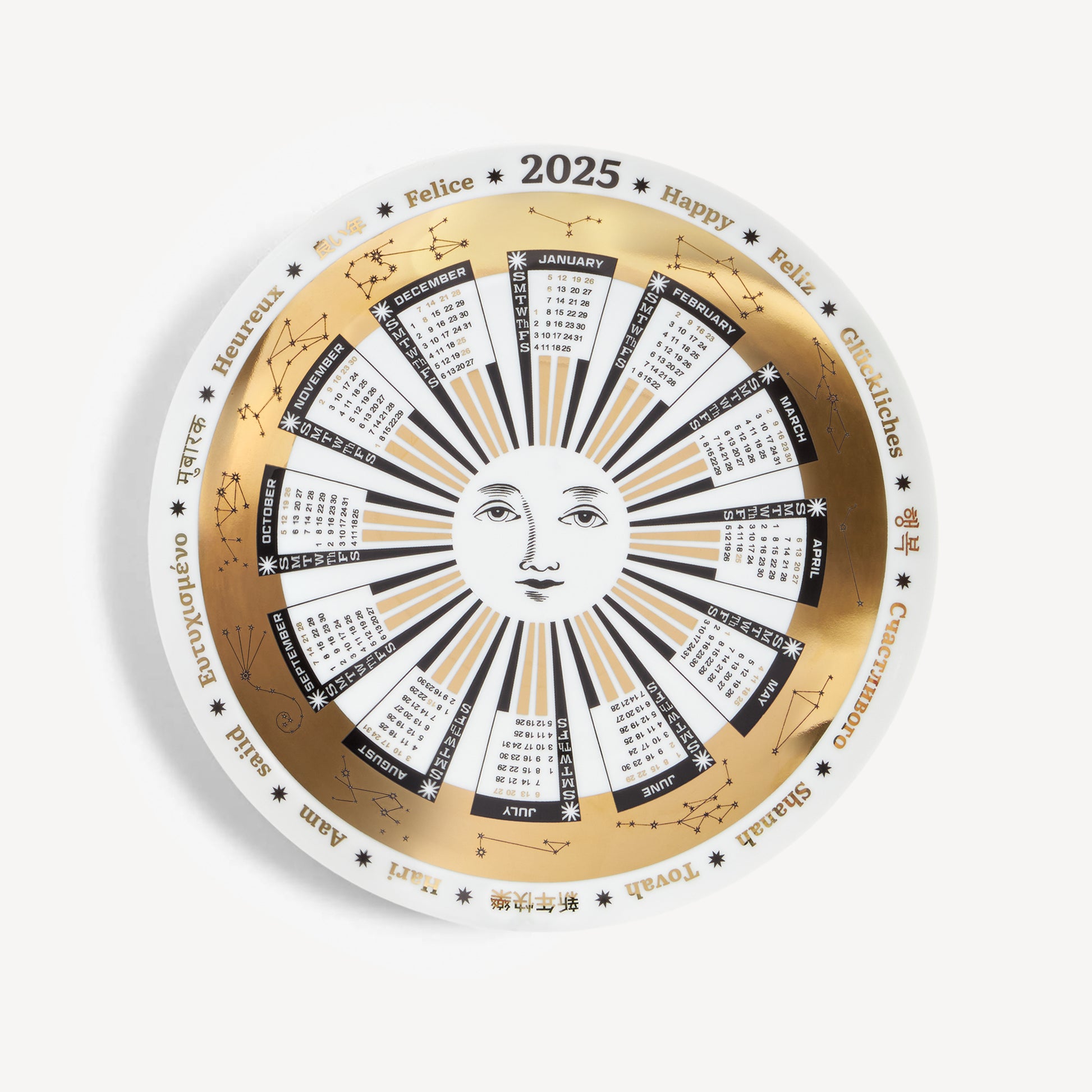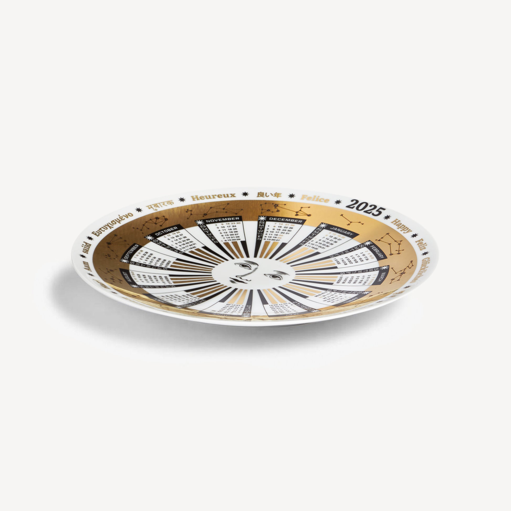 The 2025 Calendar Plate is inspired by the Fasi del Sole design: an anthropomorphic representation of the sun at its centre, symbolising the hope that the upcoming year will be a lucky one.