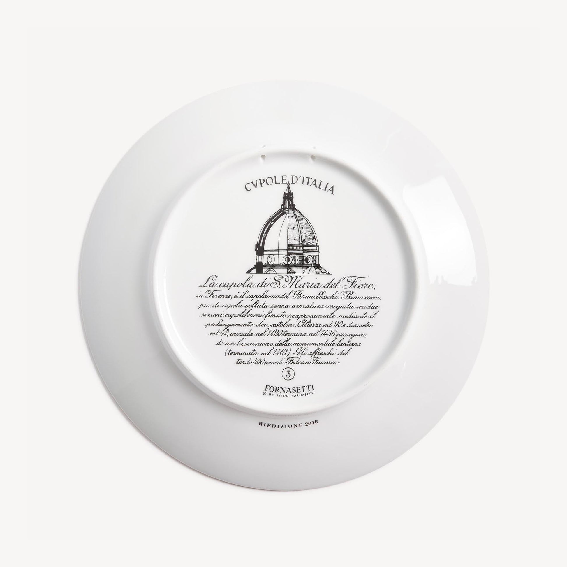 - Fornasetti loved incorporating architecture into his decorations, as evidenced by this series of plates dedicated to famous Italian domes. This hand-decorated porcelain plate with gold accents is a collector's item that you can use as a wall plate, thanks to the presence of two holes on the back, but also as an artistic ornament for your table. For cleaning, we recommend a damp cloth without any soaps or solvents.