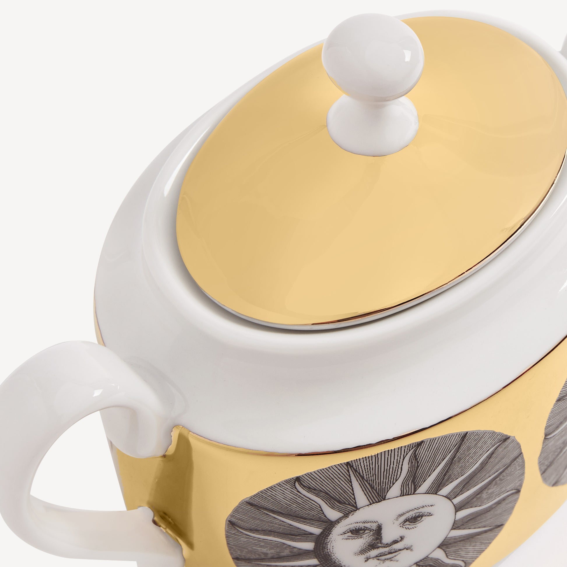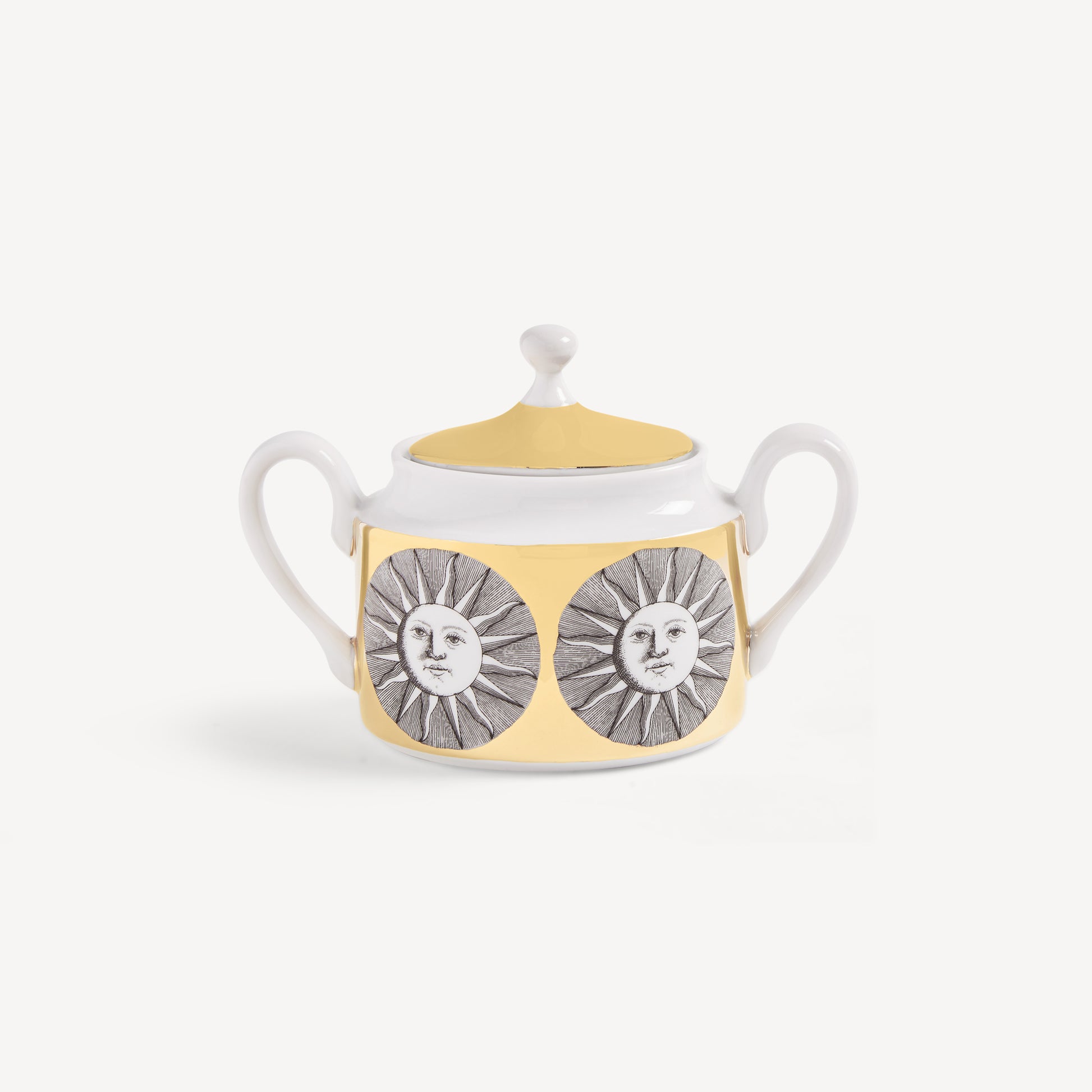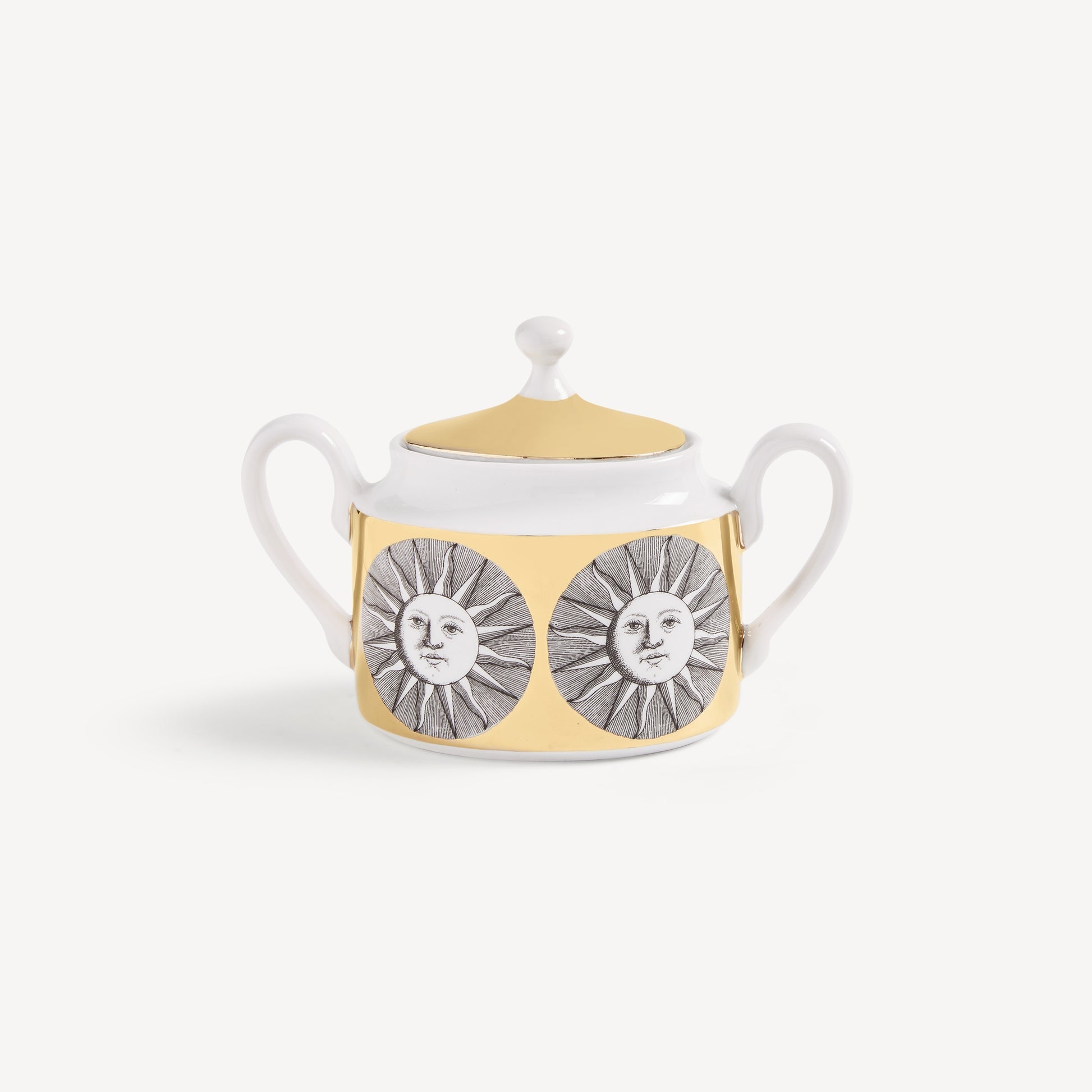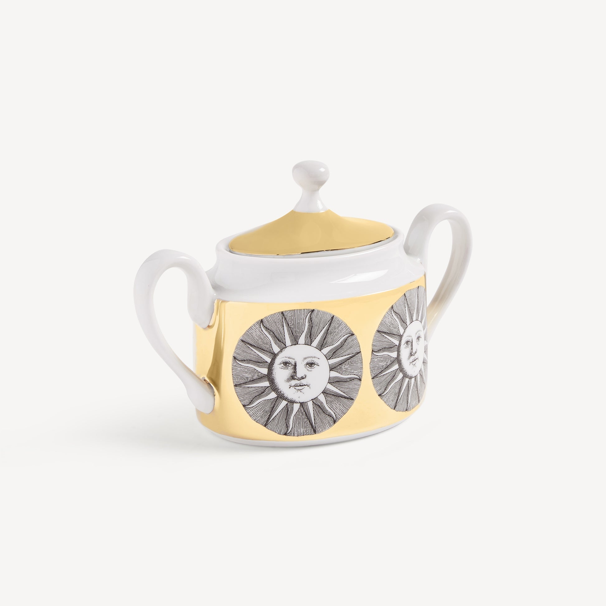 - The sun decoration graces this hand-decorated porcelain sugarbowl with gold accents, transferring Fornasetti's imagery to an object for daily use and thereby transforming it into a collector's item.