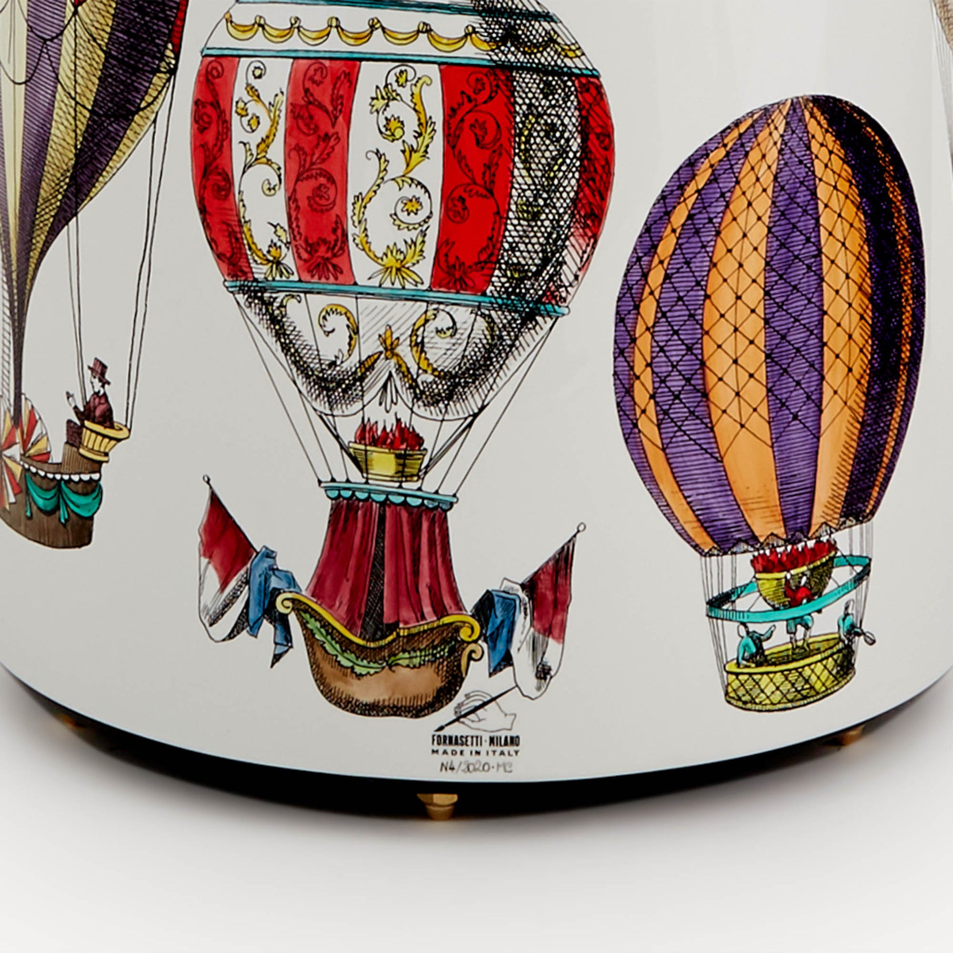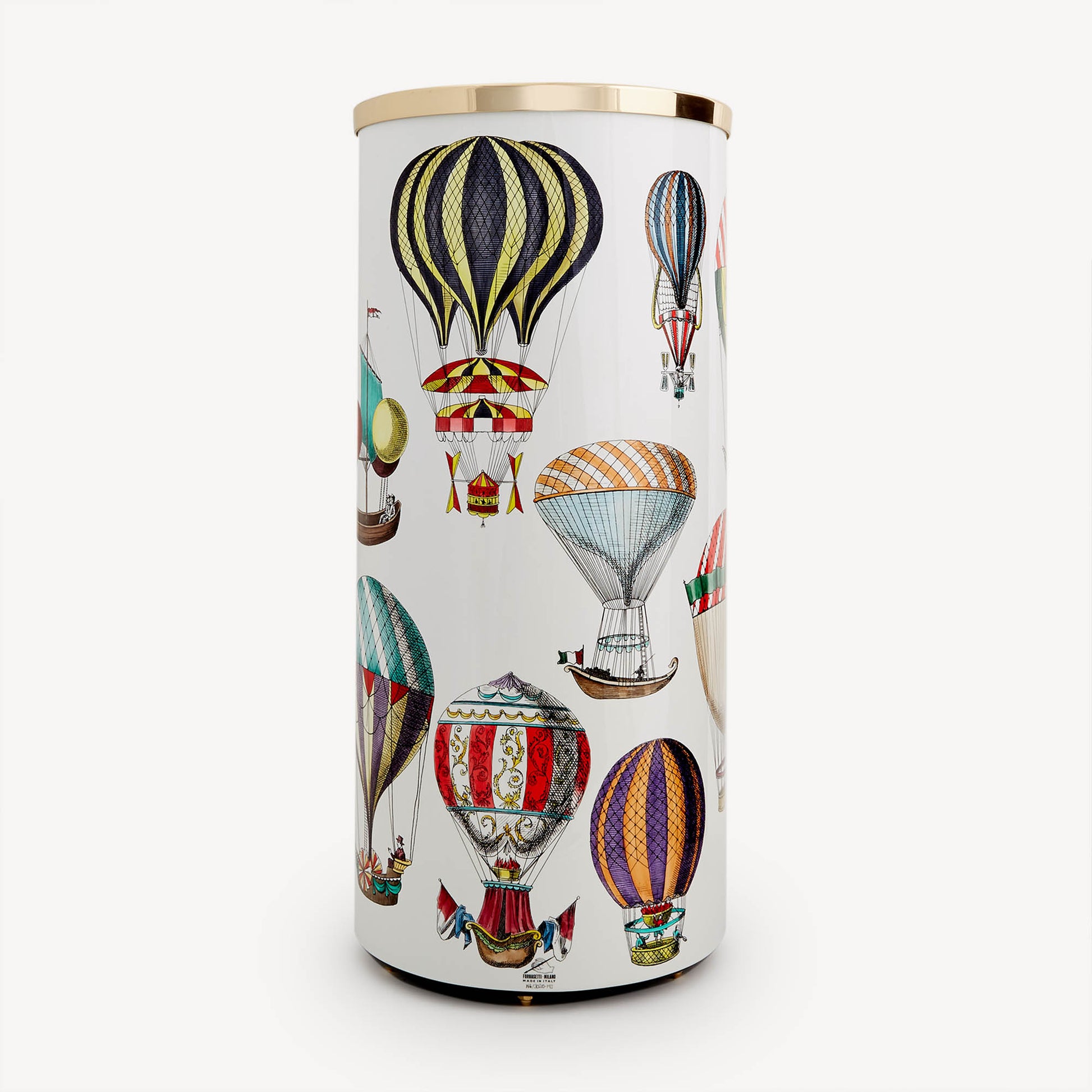 - The taste for repetition along with the decorations chasing one another across the curved surface give an up-to-date and surprising charm to this hand-painted, lacquered, and silkscreened metal umbrella stand, with a brass upper edge and equipped with feet. Its eclectic shape allows it to be transformed into a container, vase holder, or simple accessory. For cleaning, we recommend a damp cloth without any soaps or solvents.