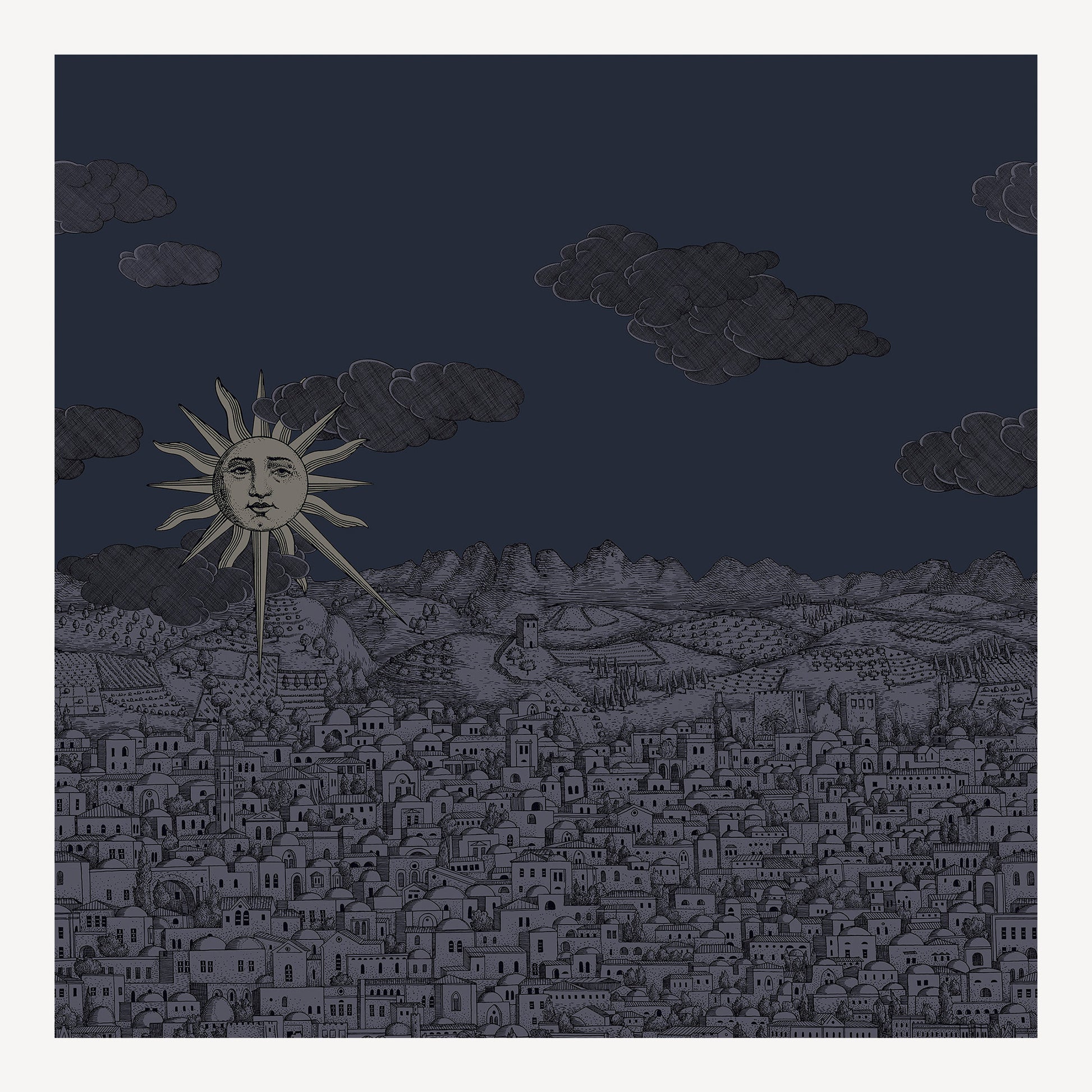 The precise black line of the buildings interprets a boundless imagination, creating an intriguing texture.